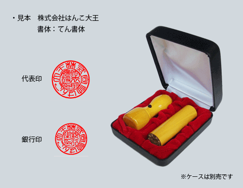 | ・代表印:18.0×60.0mm(天丸サヤ) ・銀行印:16.5×60.0mm(寸胴) ・書体・・・偽造されにくい。バランスが良い。 等の理由で、てん書体が人気です。 |